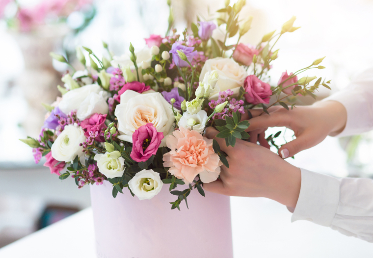 注文をいただいた商品を丁寧にラッピングし、配送に向けて箱詰めや伝票の準備を行います。花がきれいなまま届くよう工夫する、大切なお仕事です。